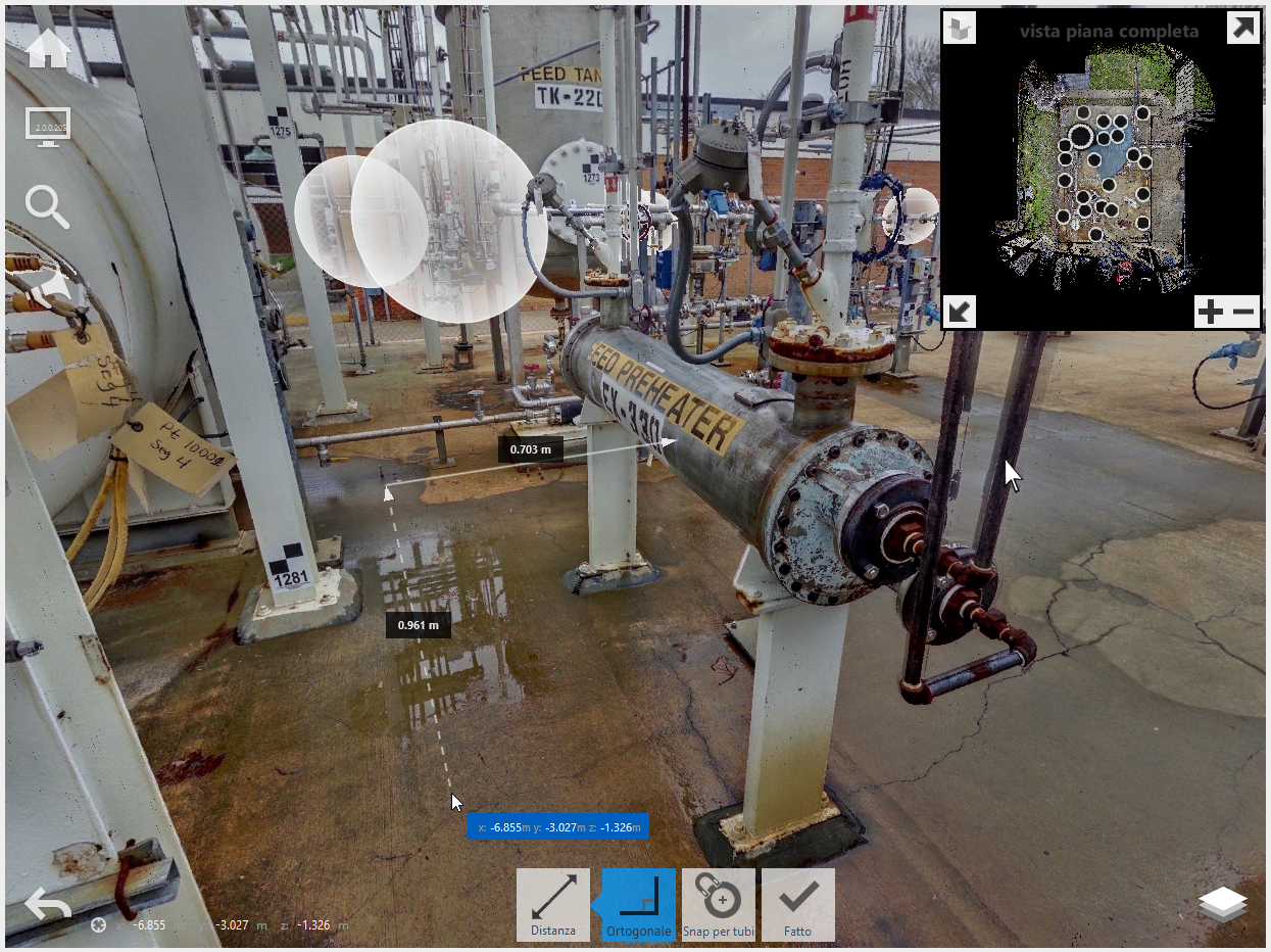 Dopo aver impostato tutti i punti e le distanze, è possibile posizionare il puntatore del mouse sulla misurazione della distanza scelta per i dettagli, nonché sui punti finali delle selezioni Snap a tubi indipendenti per visualizzare il diametro e le coordinate.