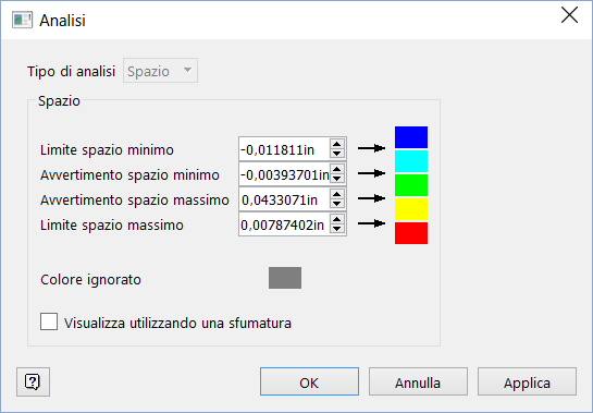 - Avvertimento spazio massimo: valore al di sopra del quale lo spazio viene evidenziato con il colore dell'avvertimento (giallo in questo caso). Gli spazi tra questo valore e quello di Avvertimento spazio minimo sono considerati accettabili.