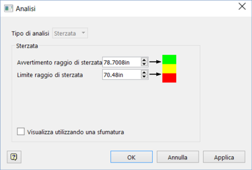 Se si seleziona questa opzione, le sfumature vengono utilizzate in base al valore della mesh della posizione specifica. Ad esempio, se il valore è inferiore a quello di Avvertimento raggio di sterzata e superiore a quello di Limite raggio di sterzata, allora il valore viene visualizzato come sfumatura a seconda del valore effettivo riferito a tali limiti e ai relativi colori.