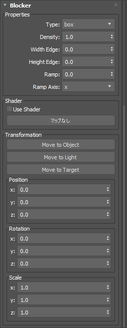 このライト フィルタはスポット ライト でのみ使用することができます。バーン ドア とは、ライトの開口部の両側にアタッチされる不透明の可動式パネルです。通常、劇場やフィルムのライティングでライト ビームのシェイプをさらにコントロールするために使用されます。