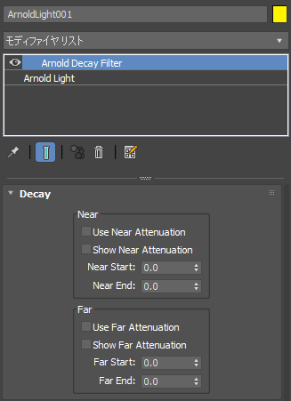 Arnold ライトに追加された Arnold decay フィルタ モディファイヤ