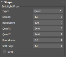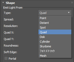 ライトの形状です。point、distant、spot、quad、disk、cylinder、skydome、photometric、および mesh の中から選択します。