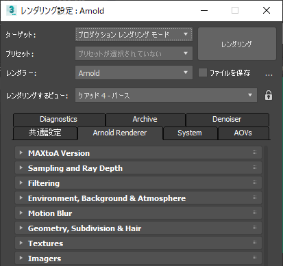 最初のタブ([共通] (Common))では 出力ドライバにアクセスでき、Arnold のレンダリングを EXR、PNG、JPEG などの形式で書き出すことができます。2 番目のタブ(Arnold Renderer)では、レンダー品質、ライト、モーション ブラーなどをコントロールするパラメータにアクセスできます。これらはグループに分類されています。4 つ目のタブ(AOVs)では、任意の出力変数(パス)をコントロールできます。
