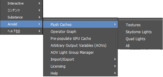 Flush Caches メニューは、メイン アプリケーション ウィンドウにある Arnold のメニューバー 内にあります。