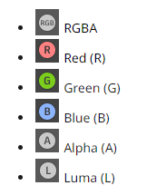 選択したカラー チャネルを RenderView に表示します。これらはツールバーのアイコンを使用して切り替えることができます。右クリック メニューも使用できます。