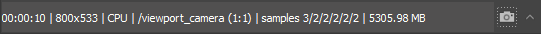RenderView の下部にステータス バーを表示します。このステータス バーには、レンダー時間、解像度、サンプリング値、メモリ使用量など、複数の役立つ値が表示されます。