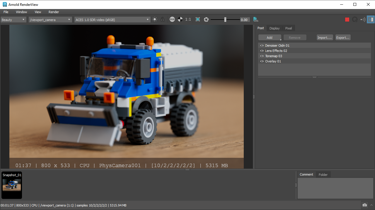 Arnold RenderView ウィンドウは、DCC に搭載されているレンダー ビューにおけるいくつかの制限事項を解決しつつ、シーンに加えた変更のリアルタイム フィードバックを提供するように設計されたインタラクティブ レンダリング(IPR)ユーティリティです。アーティストにとって使いやすい、シェーディング、ライティング、および look-dev の処理に役立つ機能が多数追加されており、操作性が改善され、変換やシーンの更新時間が短縮されています。例: