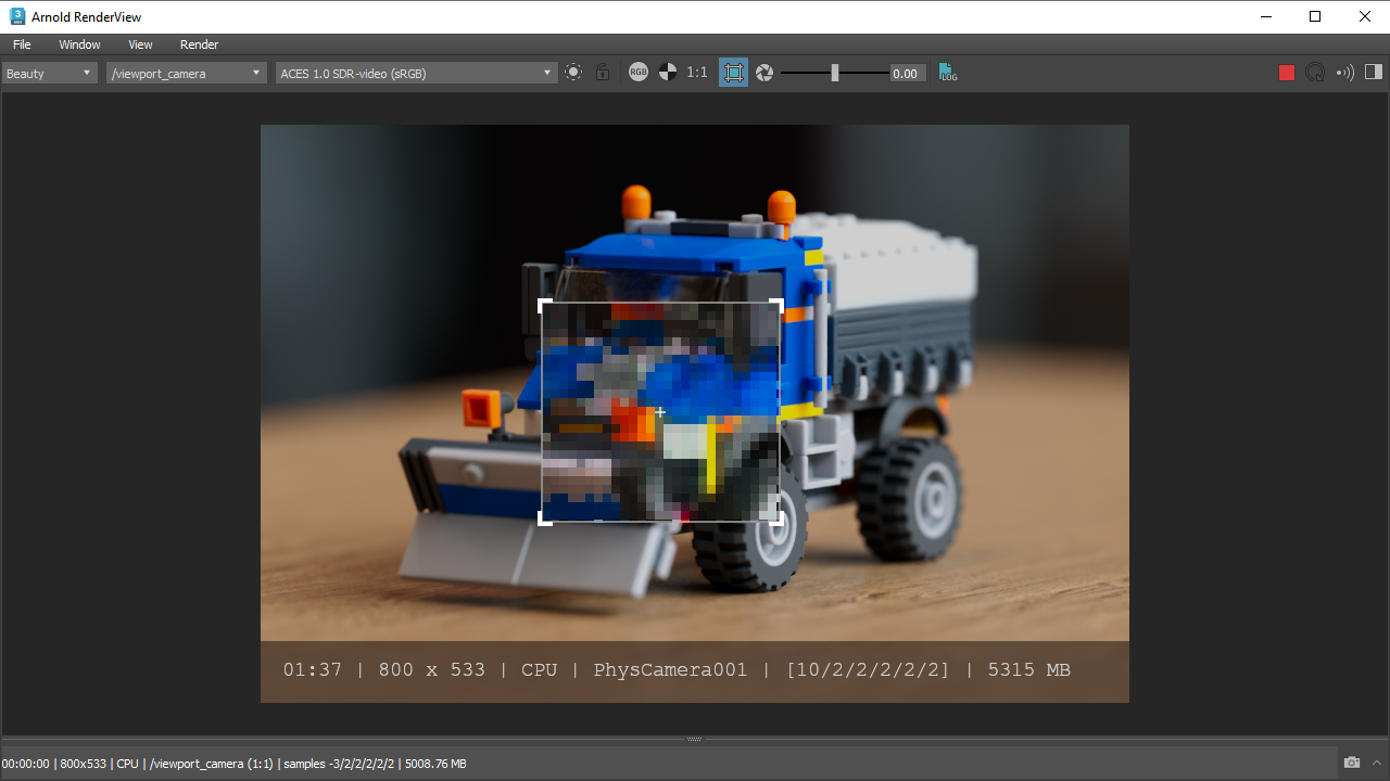 Crop Region ツールを使用すると、特定の領域のみをレンダーすることができます。これを有効にするには、メニューから*[Render] > [Crop Region]*を選択するか、アイコン
