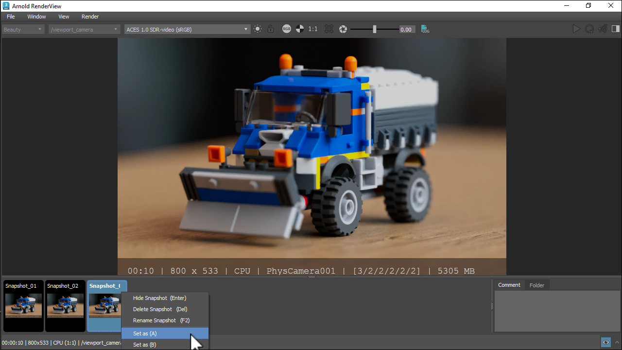 ワイプ ツールを使用して、比較する 2 つのスナップショットを選択することができます。1 つのスナップショットを選択すると、現在のレンダーと比較されます。