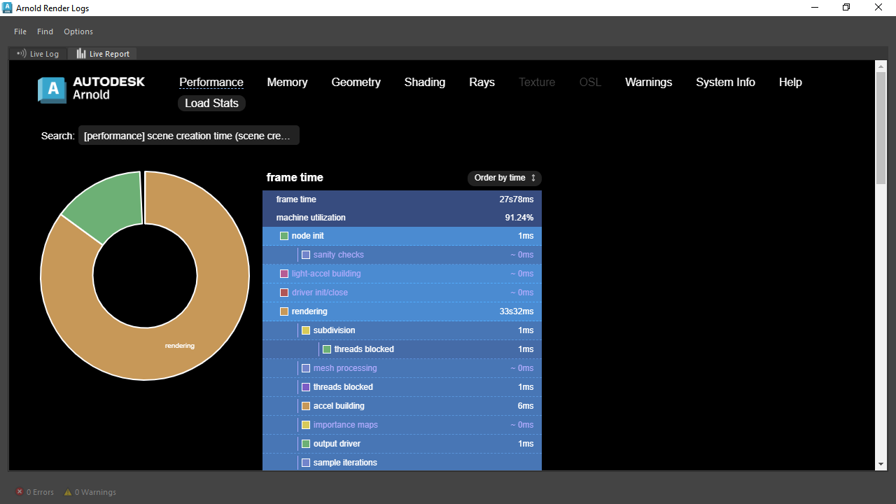 Arnold Render Logs ウィンドウを開くと、Arnold のログが読みやすい形式で表示されます。