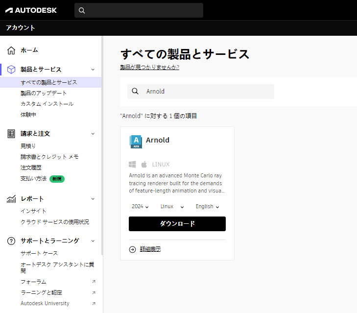 [すべての製品とサービス]で Maya、3ds Max、または Arnold を見つけます。[検索]を使用して製品を 1 つだけ表示できます。