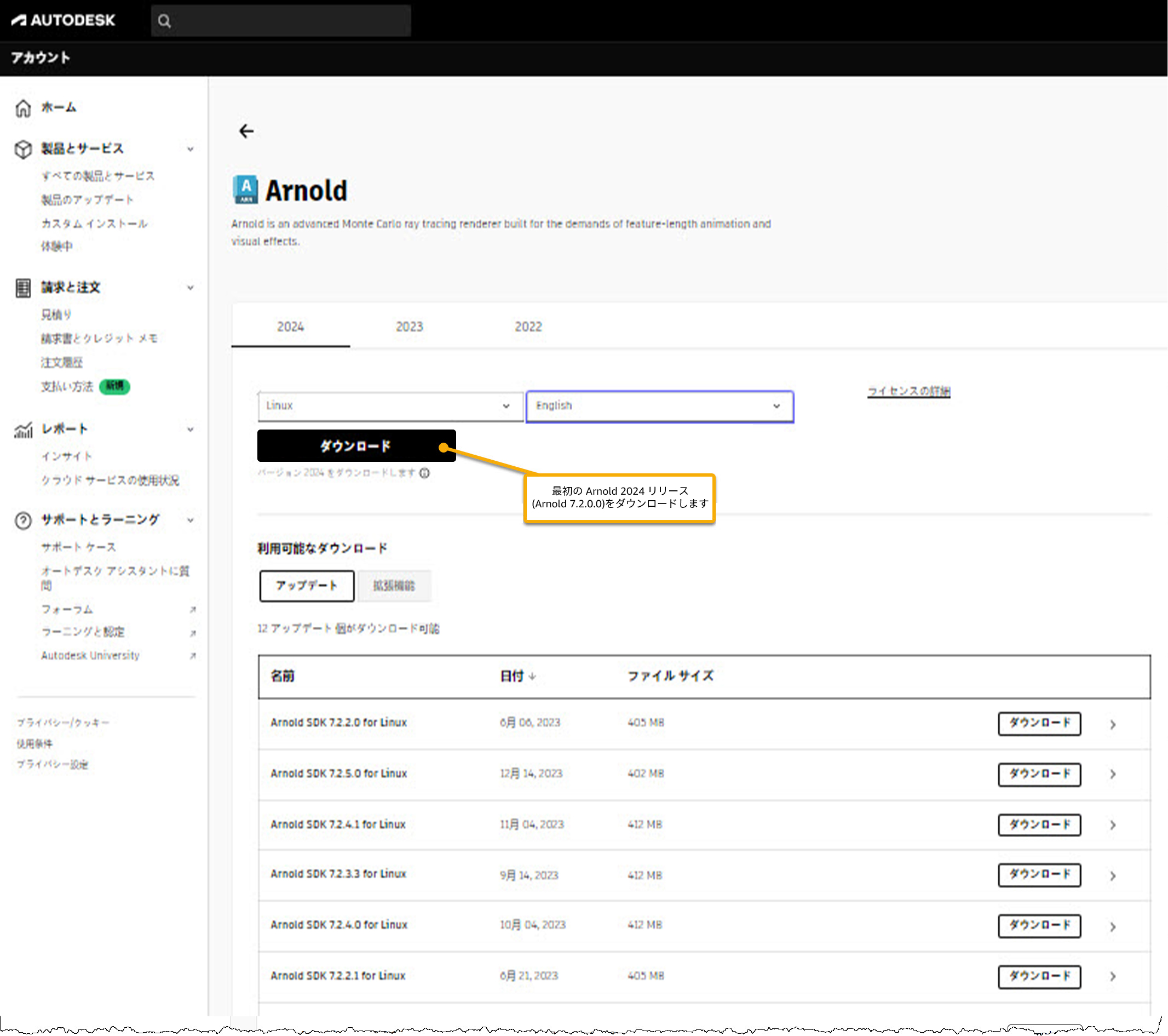 Arnold 製品の場合、Arnold SDK のダウンロードが更新プログラムになります。Arnold SDK は、ソフトウェア開発者が必要とするすべてのバイナリファイル、ヘッダ、ライブラリ、API ヘルプ ドキュメントを含むスタンドアロンのダウンロードです。