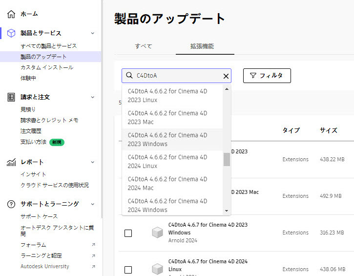Arnold プラグインは、[製品の更新]の[拡張機能]で入手できます。
