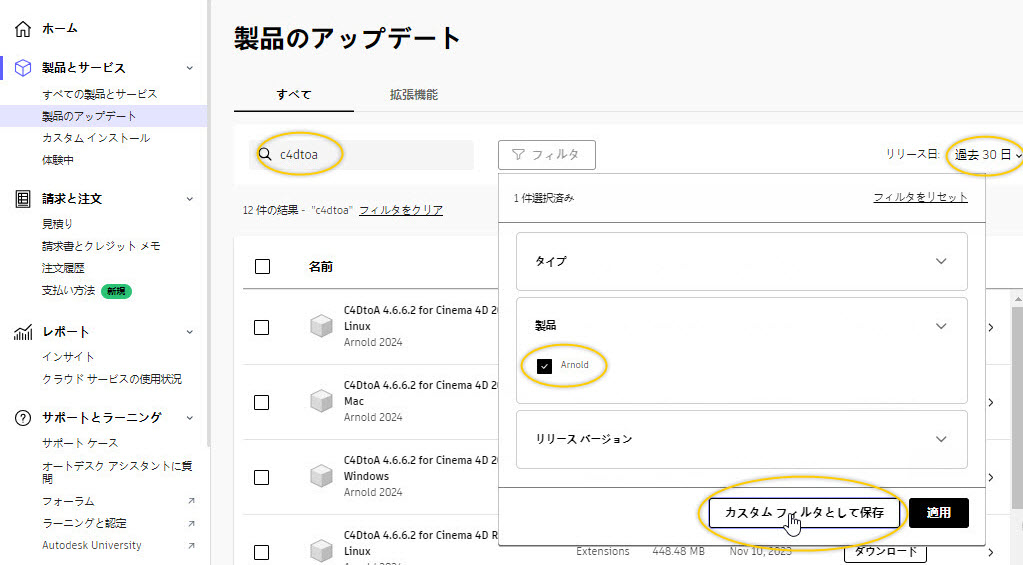 [製品の更新]では、すべての Arnold プラグインがフラットに表示され、名前、プラットフォーム、リリース日でフィルタできます。