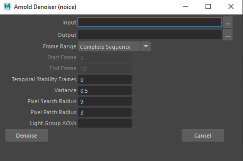 Arnold デノイザーを使用するには、Render Settings AOVs タブ(Output Denoising AOVs)でパラメータ「Output Variance AOVs」が有効になっている必要があります。