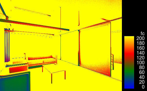 - 明るさの単位は疑似カラーで表示されます。これには入射ルクス数を表す凡例も含まれます。表示される尺度は対数で、0 からシーンで検出された最大照度までの範囲となります。使用可能なコントロールは、レンダリングの作成元のアプリケーション(例えば、Autodesk Revit)に応じて異なります。