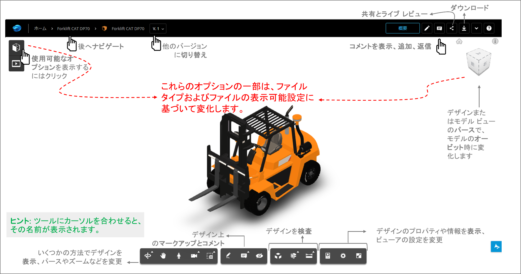 下の A360 ビューアの図、およびデザインを表示およびレビューするための各種ツールおよびオプションを参照してください。