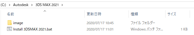 - コマンド ライン。管理イメージから install<配置名>.bat ファイルを追加します。次の例は、3ds Max 2021 用です。
