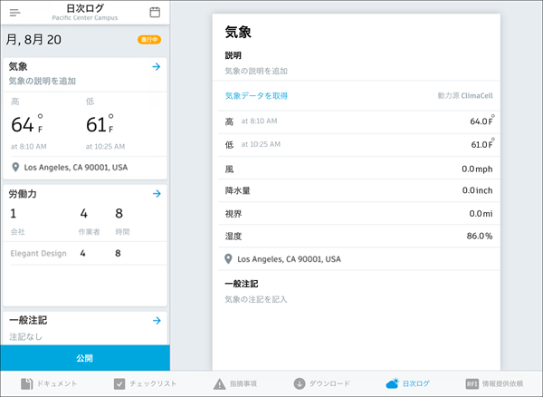 日次ログに、気象条件、労働力測定基準、進行状況の注記を追加することができます。必要に応じて日次ログを表示および更新します。iOS アプリを使用する日次ログ機能の詳細については、「BIM 360 モバイルの機能」を参照してください。
