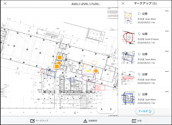 2D ドキュメントおよび 3D モデルで、マークアップの作成、表示、編集、およびその他の管理を行うことができます。iOS アプリを使用するマークアップ機能の詳細については、「BIM 360 モバイルの機能リファレンス」を参照してください。
