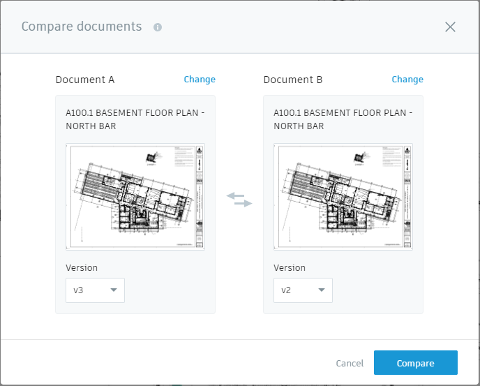 2D 比較ツールを使用できるのは PDF、DWG、DWF、および RVT ファイルです。