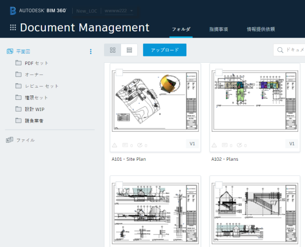 すべての BIM 360 プロジェクトには、開始時点ですでに設定されているワーク スペースが存在します。これらは特定の処理や特定のデータ タイプをサポートするように設定されています。これらの最上位ワーク スペースは、[設計図]および[プロジェクト ファイル]フォルダです。