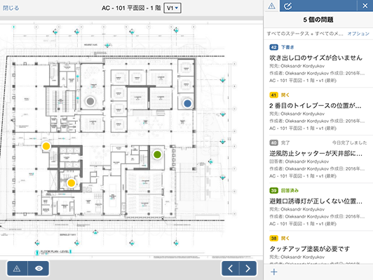 オンラインでもオフラインでも、いつでも指摘事項を作成し、編集し、割り当てることができます。指摘事項を完了することができるのは、指摘事項の作成者またはプロジェクト管理者のみです。