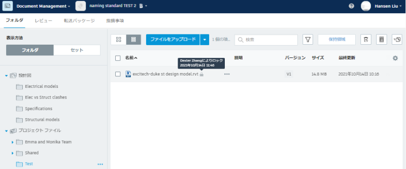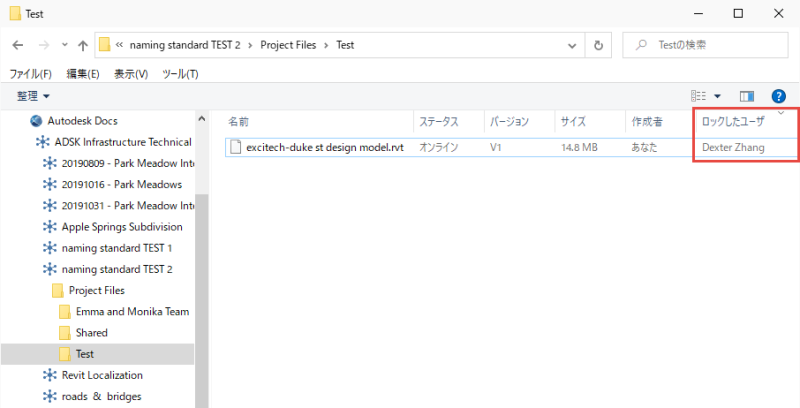 別のプロジェクト メンバーがロックしたドキュメントには、ロック ユーザ列にそのメンバーの名前が表示されます。