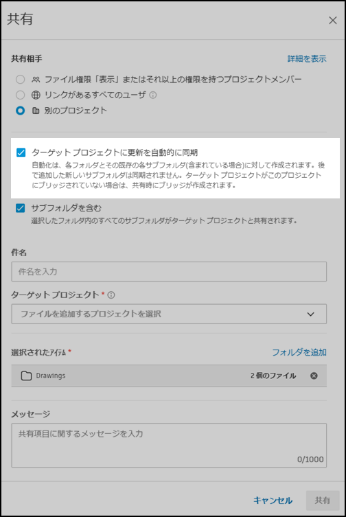ターゲット プロジェクトとフォルダ(使用可能な場合)を選択します。タイトルとメッセージの指定はオプションです。共有とここに表示されるプロジェクトについては、[ファイル]のヘルプを参照してください。