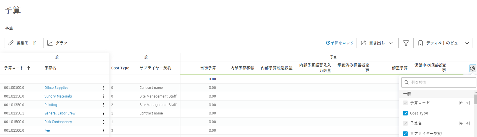 - [契約 SOV]の詳細ビューでは、[複数の契約に対して 1 つの予算] が選択されていない場合、列モードで元の予算関連の列を表示することもできます。