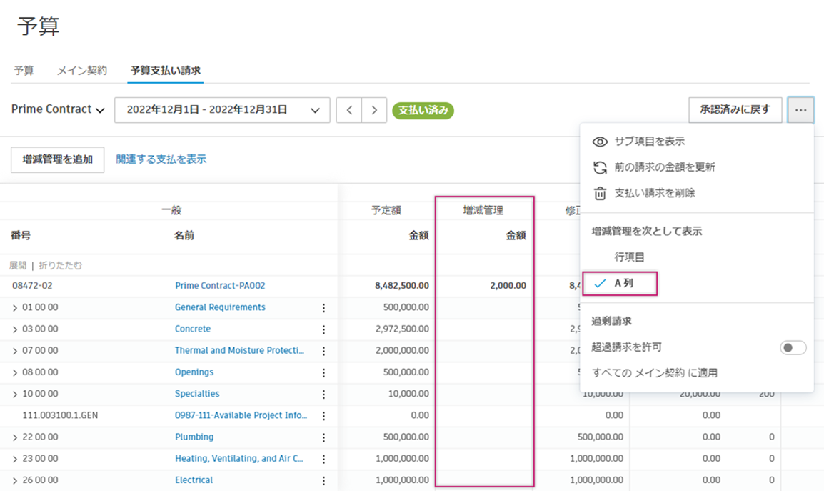 このオプションは、[予算支払い請求]、[メイン契約]、および[契約 SOV]、[費用支払い請求]、[契約]の詳細ビューで使用できます。