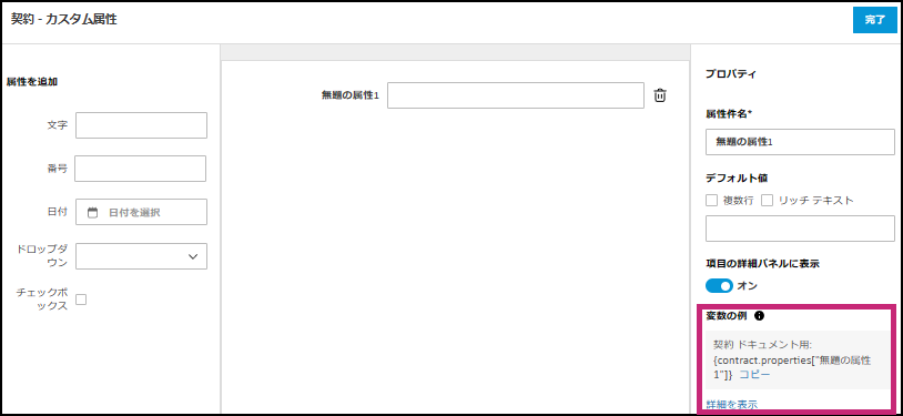 これらのカスタム属性の形式は {xxx.properties["Attribute Title"]} です。