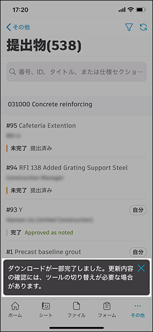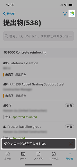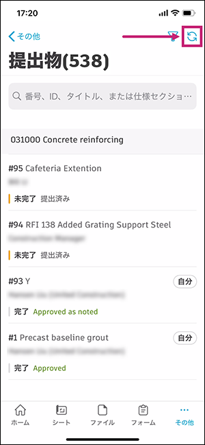 プロジェクト内同期は、Autodesk Construction Cloud mobile app 内のすべてのツール リスト ビューで使用できます。これは、次のスクリーンショットに示すように、そのツールの項目(提出物など)を一覧表示するビューです。