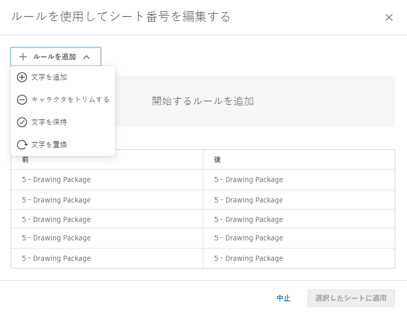 シート番号を一括編集するために、ページにルールを適用することができます。重複している文字を一意にしたい場合や、文字を追加、トリム、保持、置換したい場合に便利です。選択したページにルールを適用して、シート タイトルを一括編集することもできます。