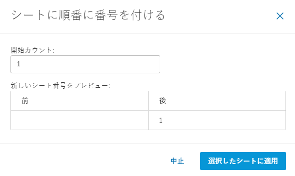 このオプションをクリックすると、各シートにファイル名と同じシート番号が付けられます。たとえば、「5 - Drawing Package.pdf」という PDF ファイルの場合、シート番号は各シートで「5 - Drawing Package」になります。シート番号の重複は許されないため、一意のシート番号を作成するルールを適用して手動で編集する必要があります。