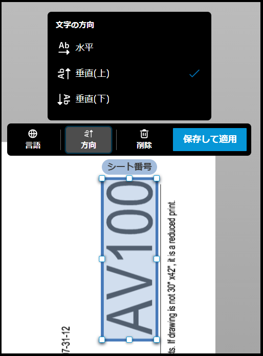 シート番号が水平ではないために、正しく抽出されない場合があります。その場合は、[方向]をクリックして、OCR が文字の方向を読み取る方法を変更します。次の例では、シート番号が垂直方向に下から上に読み込まれます。
