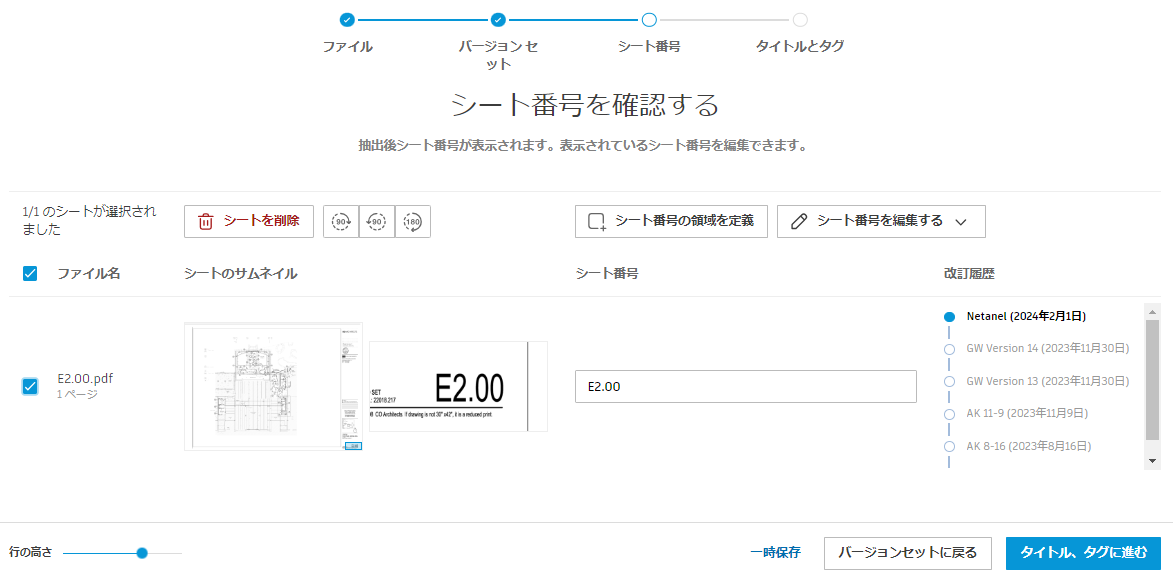 | シートの作成元となったファイルの名前。 | シート全体のサムネイルが表示されます。シートの方向が正しくない場合は、チェックして回転することができます。 タイトル ブロックが拡大され、抽出されたシート番号と比較して、編集が必要かどうかを確認することができます。 |