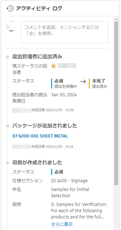 - 提出項目に関連するすべてのアクティビティの履歴が表示されます。