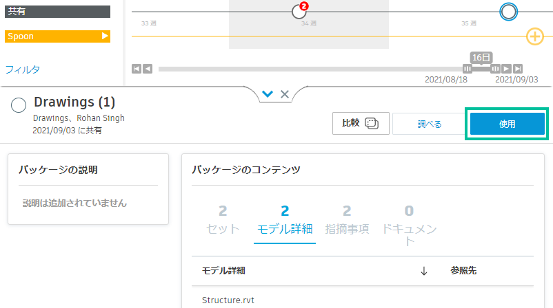 Revit の作成者が他のチームが使用しているオンライン モデルにリンクしている場合、それらの Revit リンクは自分のチームのオーサリング環境で自動的に更新されます。タイムライン上で、共有行のパッケージ ノードが塗り潰され、そのパッケージが使用されたことが確認できます。