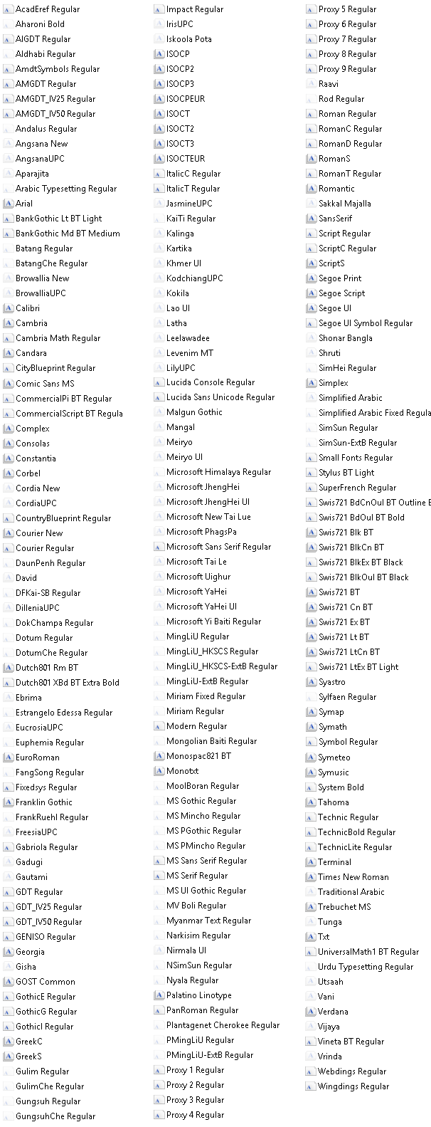 Configurator 360 でサポートされているフォントのリスト