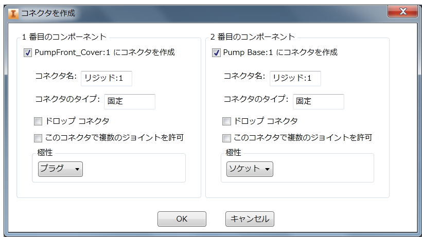 結合したコンポーネント ドキュメントごとにコネクタが 1 つ作成されます。ドキュメントにジョイントと同じ名前のコネクタが存在する場合、コネクタは作成されずに編集されます。