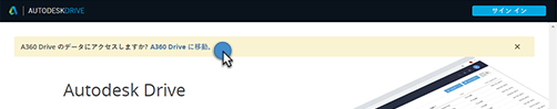 2020 年 3 月中旬以降、A360 Drive のユーザは Autodesk Drive のホーム ページにリダイレクトされます。A360 Drive にアクセスするには、Autodesk Drive のホーム ページの上部に表示される「A360 Drive のデータにアクセスしますか?A360 Drive に移動」の[A360 Drive に移動]をクリックします。