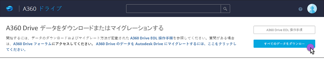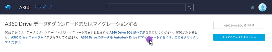 AutoCAD Web および Mobile アプリケーションを使用して A360 Drive にアップロードしたファイルは、Autodesk Drive に移行されません。これらのファイルに問題がある場合は、オートデスク サポートに連絡してください。
