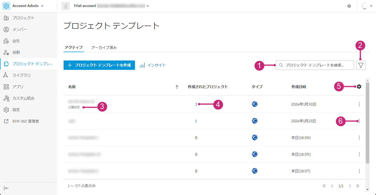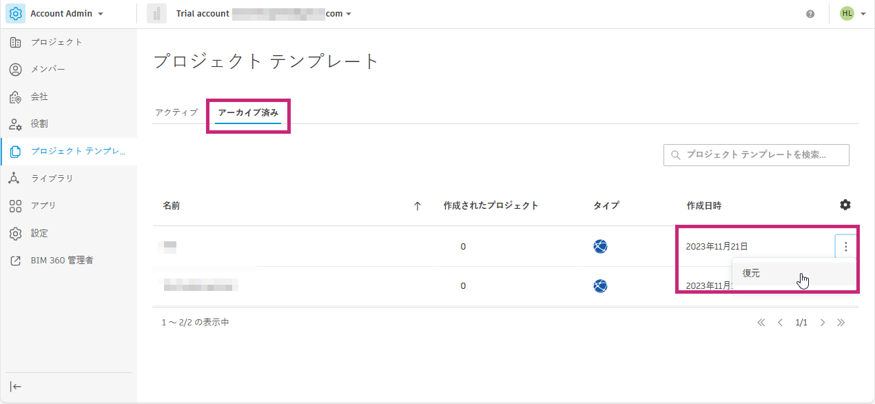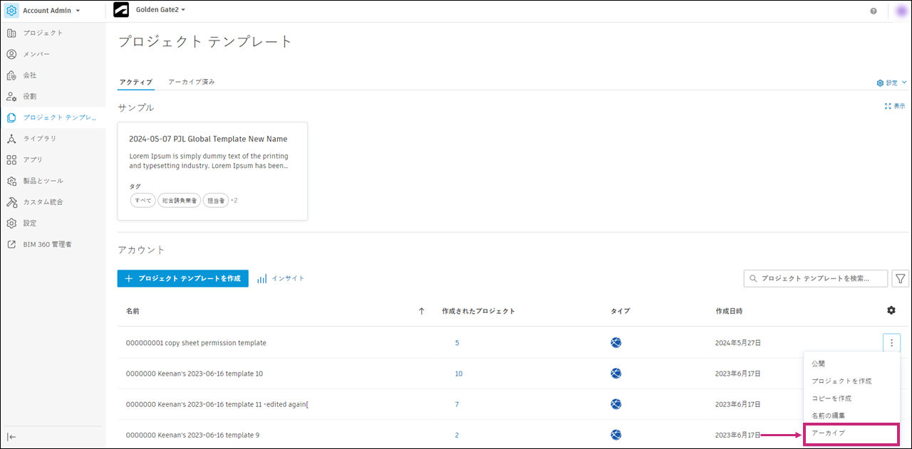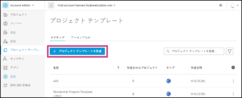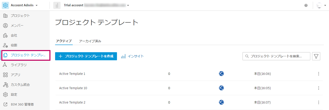 アクティブなプロジェクト テンプレートとアーカイブされたプロジェクト テンプレートは、Account Admin の [プロジェクト テンプレート] ツールで見つけることができます。