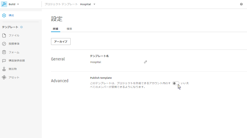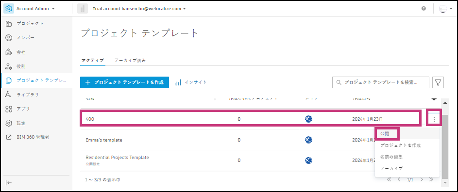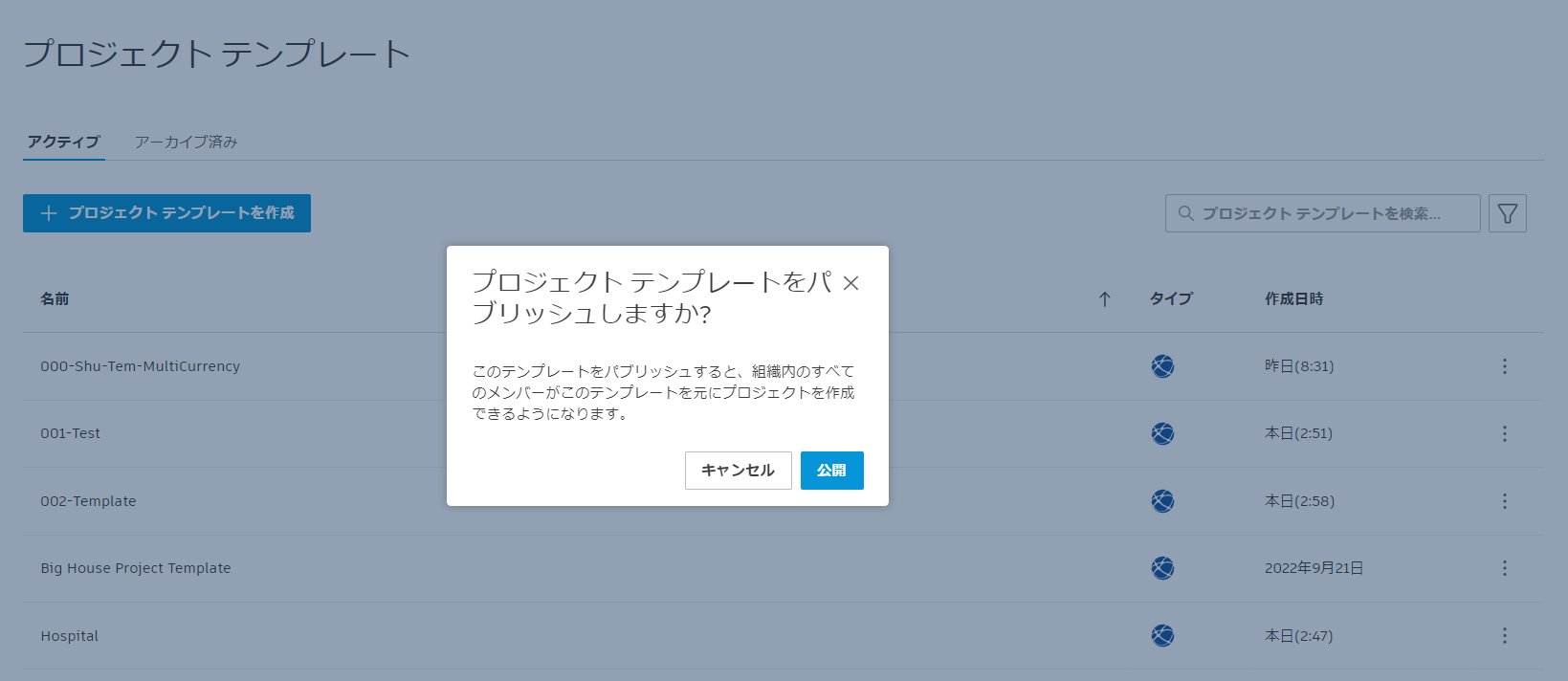 を選択します。アカウント管理者は、プロジェクト テンプレートを公開設定できるようになりました。公開設定されたテンプレートを使用すると、アカウント管理者は組織内のすべてのプロジェクト作成者がプロジェクト テンプレートを簡単に使用することができるようになります。