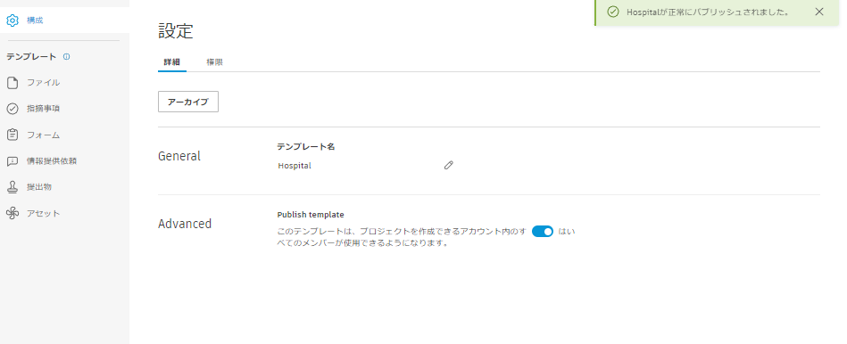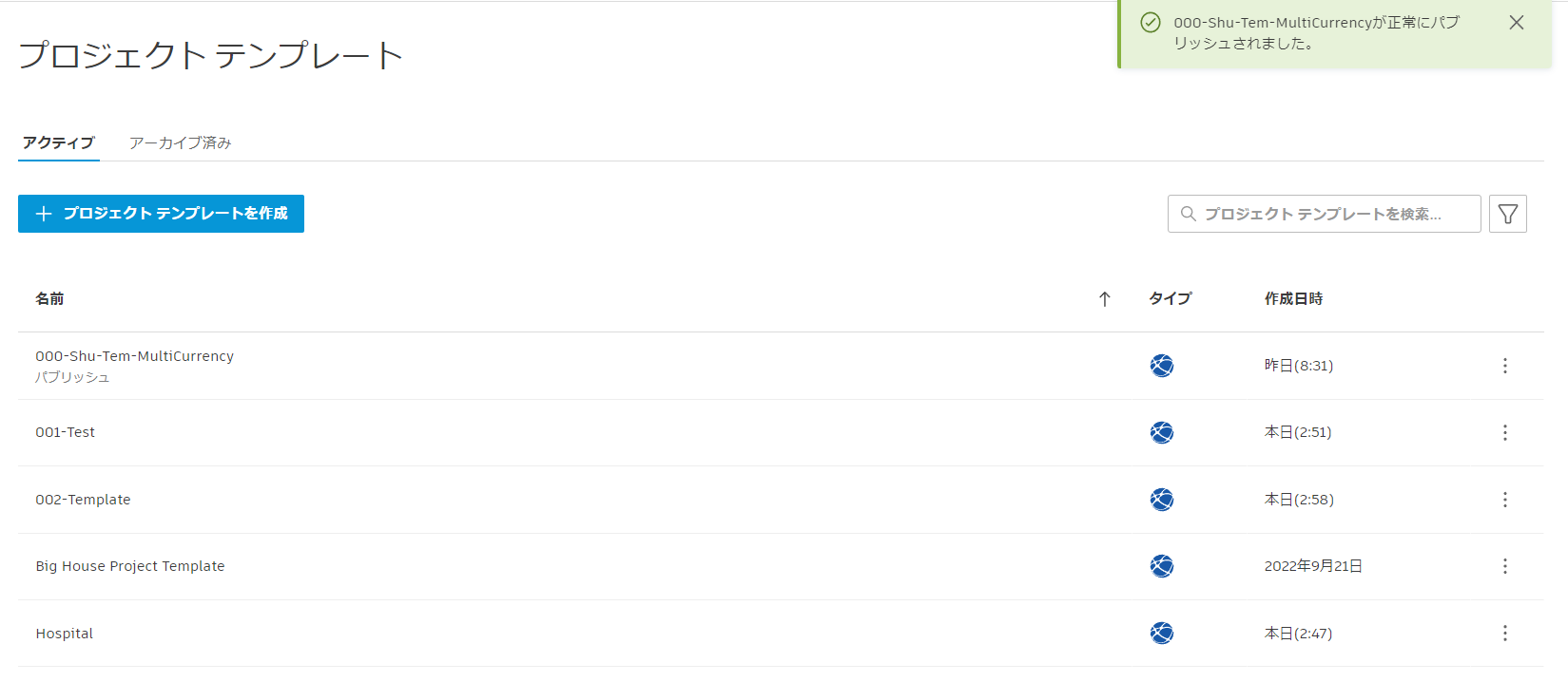 プロジェクト テンプレートが正常に公開設定されたことを知らせるメッセージが表示されます。