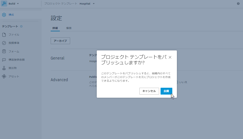 プロジェクト テンプレートを公開します。ボックスが表示されたら、[公開] ボタンをクリックします。