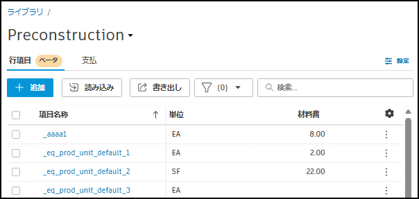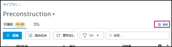 このページから [行項目] タブと [支払] タブにアクセスして、Estimate および Takeoff で使用するライブラリ項目を設定できます。