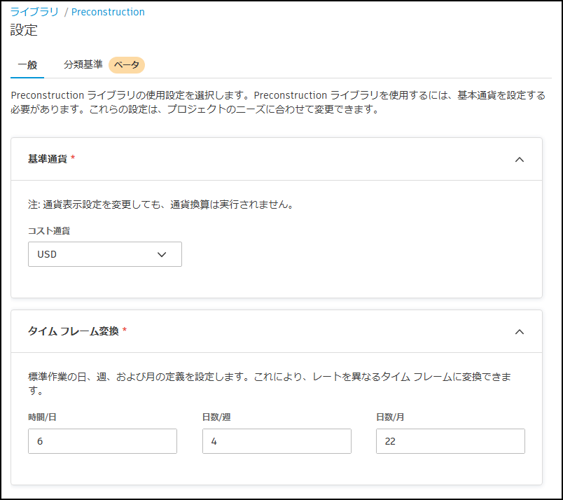 基本通貨とタイム フレーム変換の一般設定を構成し、施工準備ライブラリ設定の施工準備ライブラリに分類基準を割り当てます。アカウント管理者は、[施工準備]ライブラリ ページで [設定] リンクをクリックして、これらの設定にアクセスできます。