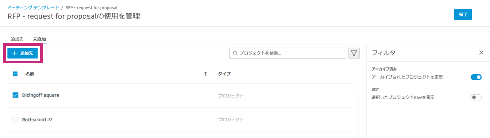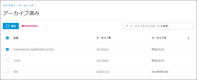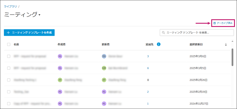 アーカイブ済みのテンプレートは、追加されたプロジェクトで使用できなくなります。テンプレートをアーカイブしても、以前にそのテンプレートから作成されたミーティングには影響しません。